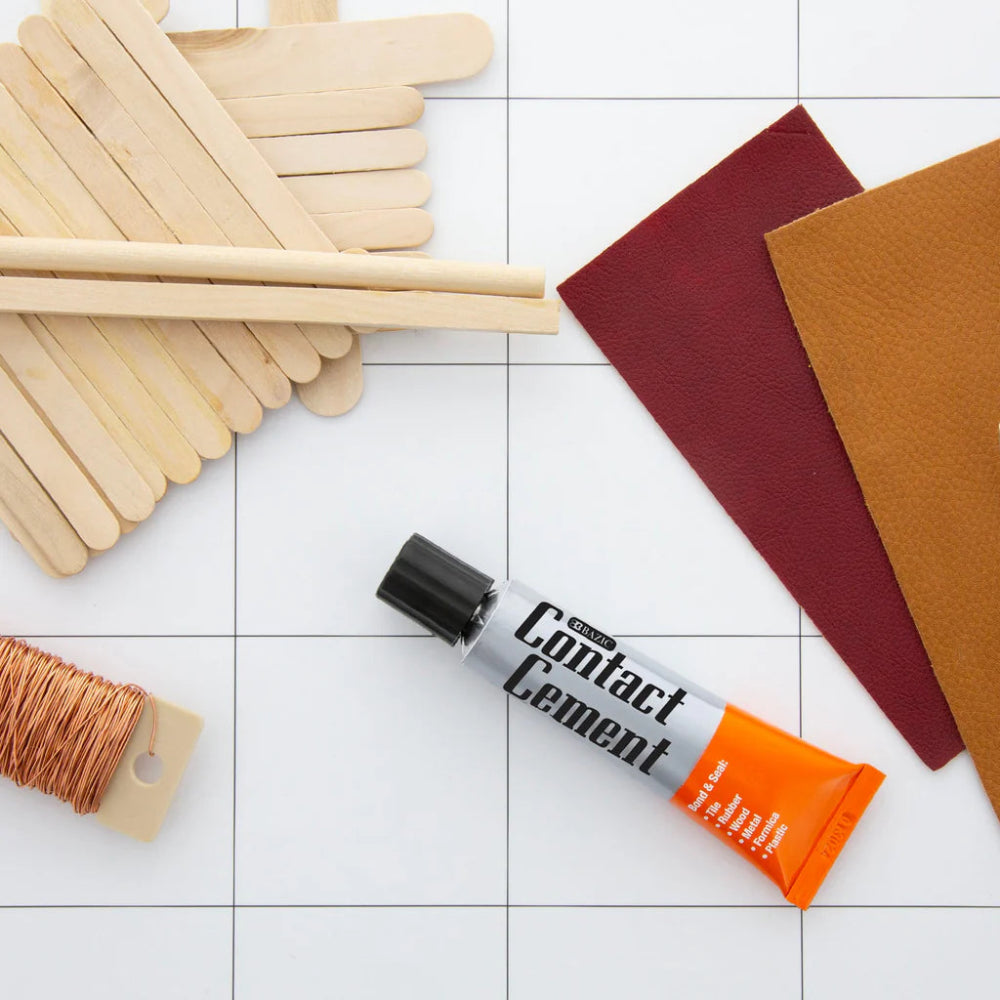 BAZIC Contact Cement (1 fl. oz./30 mL) is a strong, fast-drying, yellow-tinted adhesive for bonding materials like wood, metal, rubber, leather, and plastic. Ideal for crafts and repairs, it features a 5-10 minute dry/cure time, is latex-free, and comes in a squeeze tube.