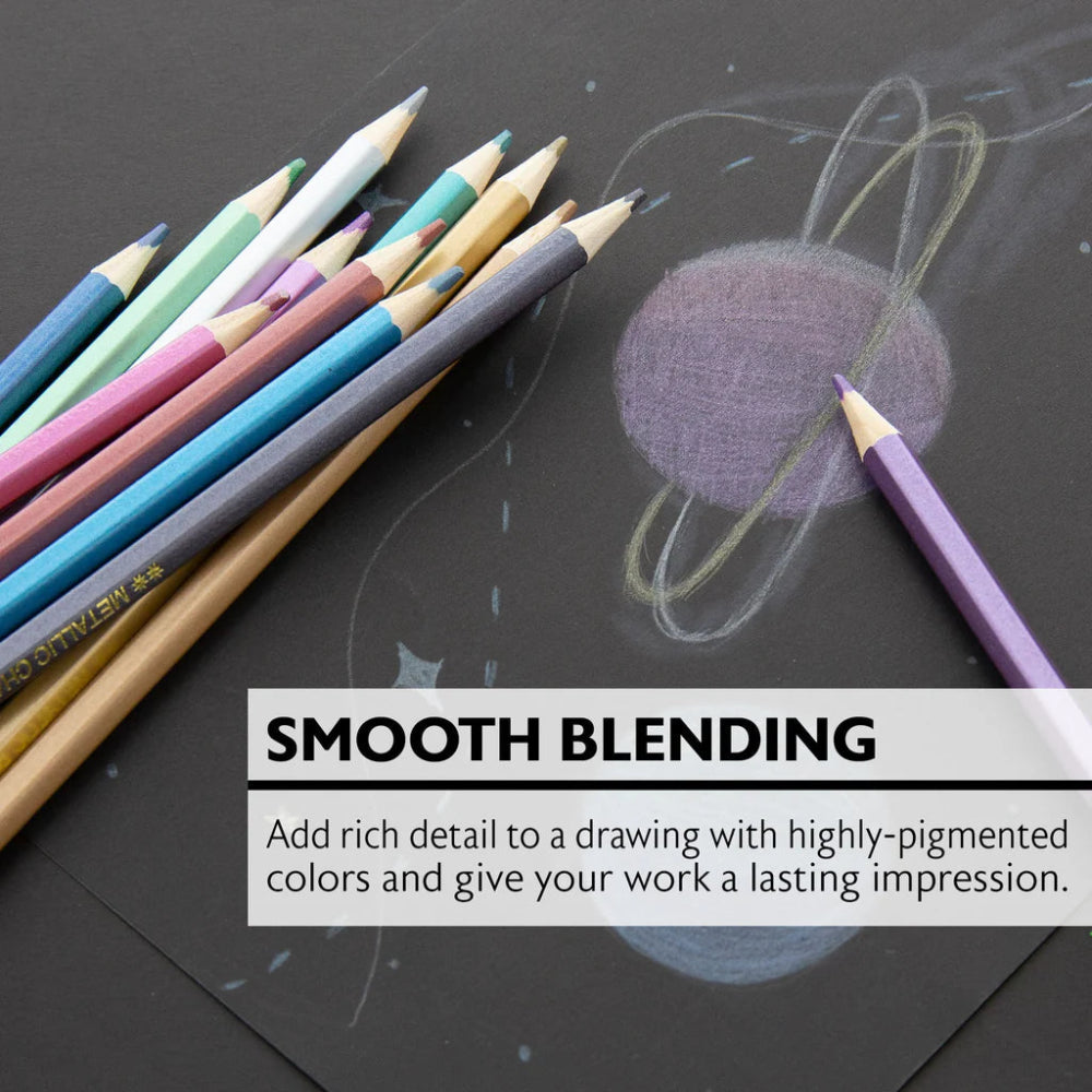 Bazic Metallic Colored Pencils, 12pk feature 12 shimmering, highly-pigmented metallic colors for adding shine, offering smooth, blendable coverage with durable tips that resist breaking, coming pre-sharpened for immediate use in drawing, coloring, and crafts for both kids and adults.