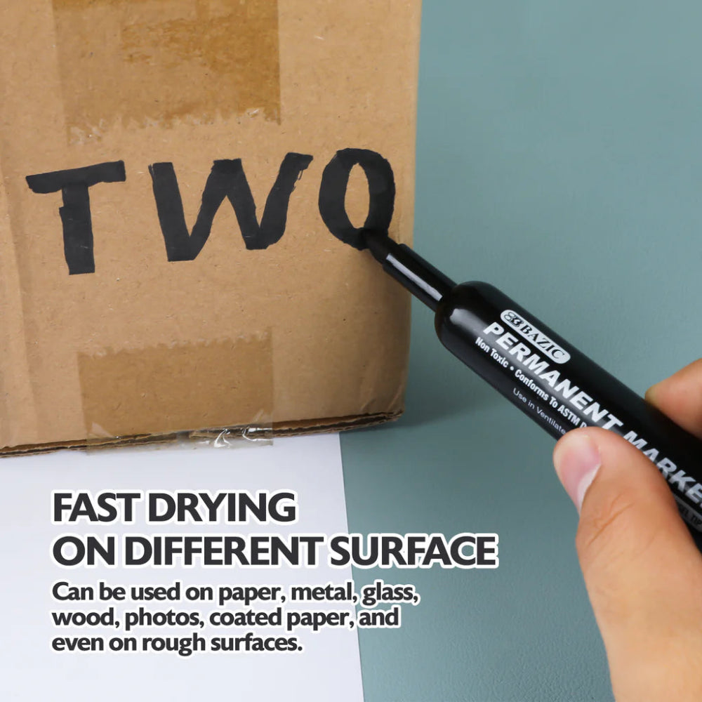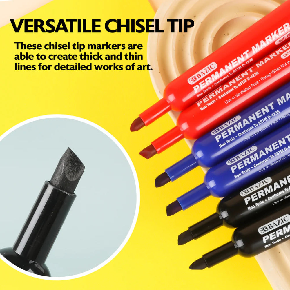 Bazic Permanent Markers (12-pack, Assorted Colors) feature versatile, durable chisel tips that create both thick and thin lines, ideal for writing, drawing, and marking on surfaces like paper, plastic, metal, and glass. The quick-drying, fade-resistant, and waterproof ink ensures long-lasting, smudge-free performance.