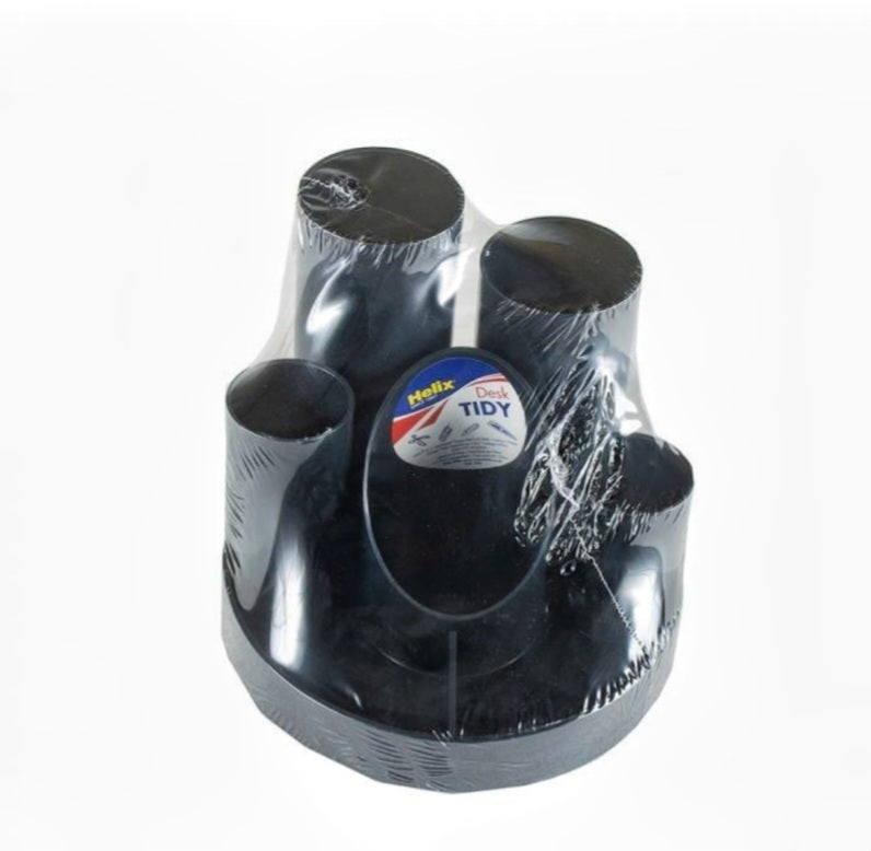The Helix Clear-up Desk Tidy is a popular, compact, and durable stationery organizer featuring 5 varied-height tube compartments, two front trays for small items like paperclips, and a central space suitable for a mobile phone. Available in black and blue, it is designed for home or office use to keep desks organized.